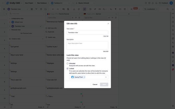 Views determine which data in a Grid is displayed and how. They also enable users to control access to content. Views represent a way to display all or a subset of data in a customized format for different use cases. For example, different Views can be created for translators, LQA, or external contractors within one Grid.