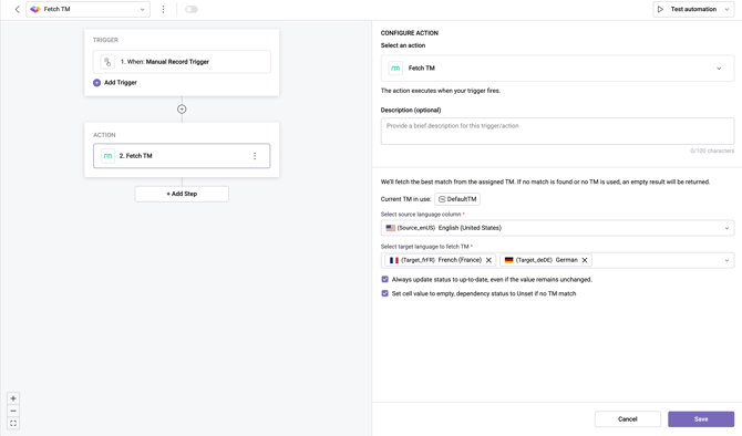 The Fetch TM automation action enables you to automatically retrieve Translation Memory (TM) matches for multiple target languages in a single step. This action combines the efficiency of multi-language translation actions with the flexibility of TM matching, making it ideal for setting up localization workflows quickly.