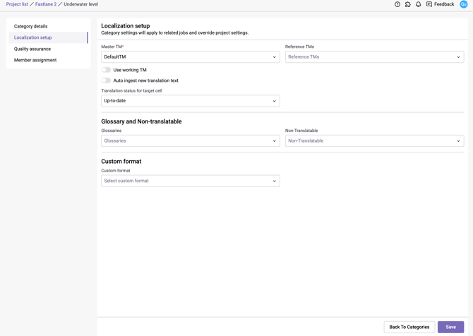 Localization setup: Add localization resources such as translation memory and glossaries to your Category to improve translation speed and quality. New categories will use the project's localization settings by default. Adjusting these settings will override it.
