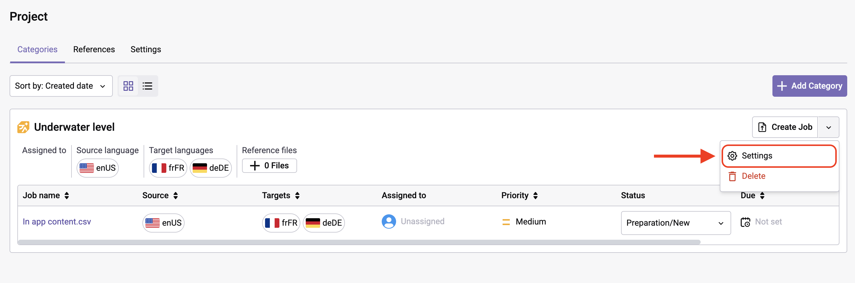 Categories in Gridly TMS help you organize Jobs with the same characteristics in a Project for more efficient management. They allow you to add shared resources and specify requirements that all Jobs within the Category must follow.