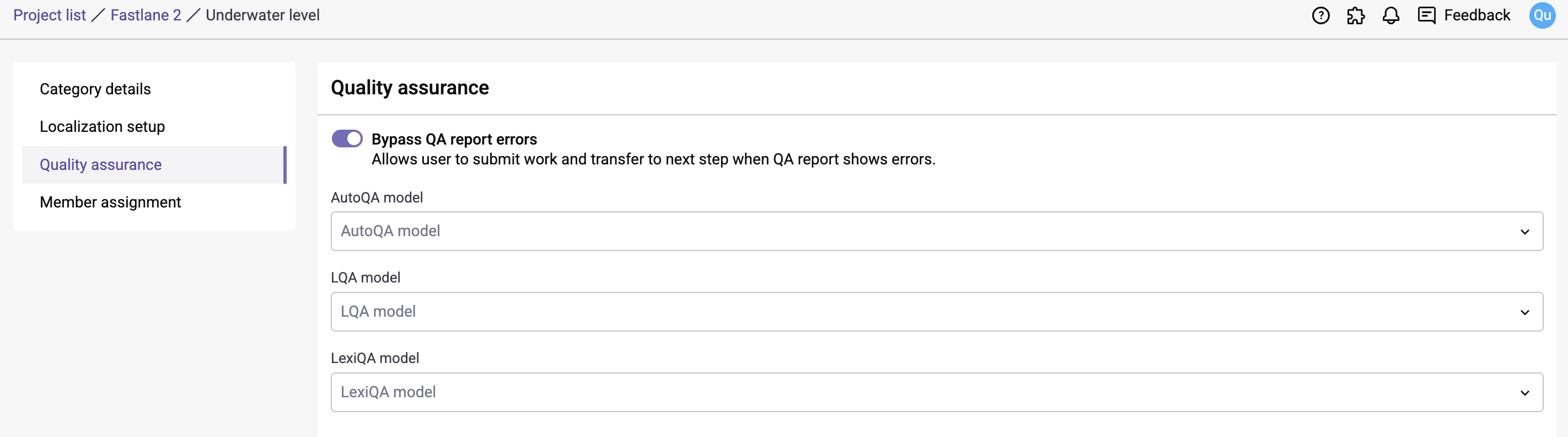Bypass QA report errors: Toggle on to allow users to submit work and transfer to next step when there are QA check errors.