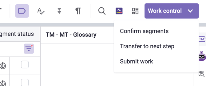 - Submit work: Completes current TMS workflow step. All segments must be confirmed before submitting. Once submitted, the segments become read-only.