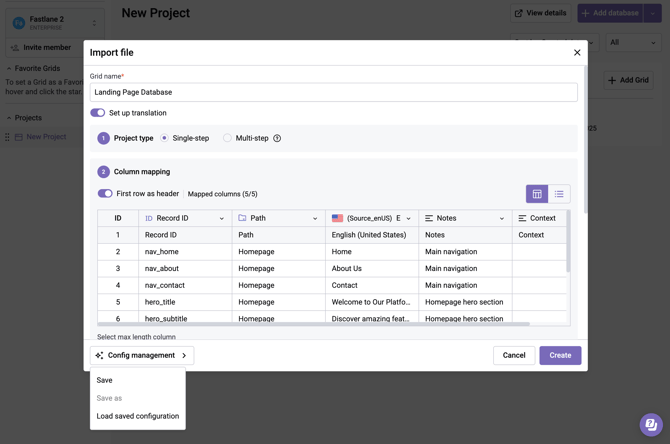 The Excel file import in Gridly CMS includes a configuration management system that allows you to save and reuse your settings.